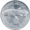 5 франков km#15 1984,92 Алюминий Знак(и) на монете: Рог изобилия, рыба Всемирная рыболовная конференция Латимерия |