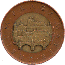 50 крон km#1 1995- н. - Сталь, покрытая медью, вн.- Сталь, покрытая латунью Знак(и) на монете: Коронованая буква b (Яблонец-над-Нисоу) Пражский град |