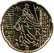 10 евроцентов km#1410 2021- Медно-алюминиво-цинково-оловянный сплав Знак(и) на монете: Рог изобилия, квадрат Девушка-сеятель |