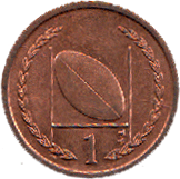 1 пенни km#823.2 1998,99 Сталь, покрытая бронзой Знак(и) на монете: РМ (Pobjoy Mint), Трискелион Мяч регби |