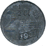 2,5 цента km#171 1941,42 Цинк Знак(и) на монете: Кадуцей (Утрехт) Период оккупации Нидерландов Германией во время II мировой войны Почти весь выпуск 1942г. расплавлен, известно около 30 экземпляров |