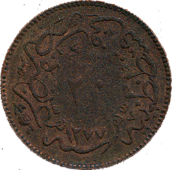 20 пара km#701 1864(1277 ah - 4) Медь На реверсе всегда чеканилась дата прихода к власти (1277 ah), на аверсе - год правления. |